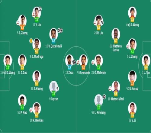 后卫:33-高准翼、5-郑铮(46'22-李源一)、55-彭啸、11-刘洋(84'17-吴兴涵)