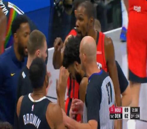 在比赛第三节末端,杜兰特与其篮网时期队友布鲁斯-布朗互喷垃圾话险些酿成冲突,两人在各自队友与裁判的劝说下没有将事态升级。